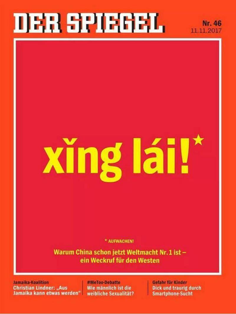 无独有偶。德国《明镜周刊》11月刊也以中国为封面。红色打底、字体金黄,汉语拼音“xing lai!”(醒来)的标题,极具视觉冲击力。
